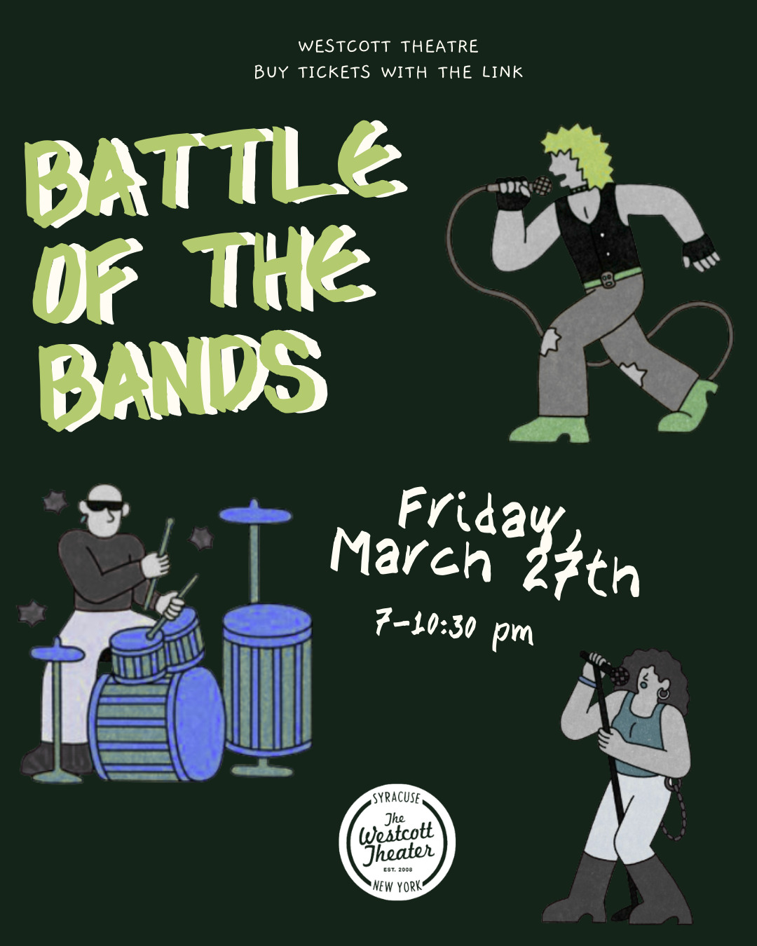 Get ready to rock Syracuse! The Westcott Theater is hosting the Battle of the Bands on Friday, March 27th from 7–10:30 PM. Student bands will take the stage and compete in an electrifying night of live music, raw talent, and non-stop energy. Whether you're a die-hard music fan or just looking for a great night out, this is the place to be. Cheer on your favorite acts as they battle it out for the top spot in one of Syracuse's most beloved venues. Grab your tickets now through the link.